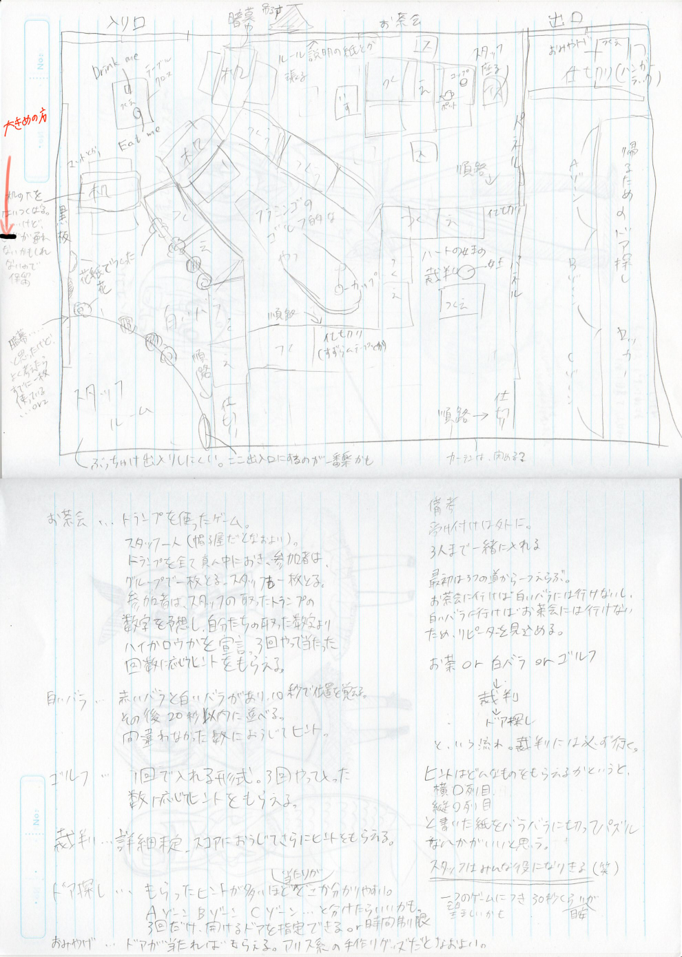 まず、画像左上。そこが入り口です。アリスでは、最初に入る部屋ですね。Drink meとEat meの小物とかあるとそれらしくていいです。その空間を作るために暗幕を吊るして円形になるといい感じ。そこには3つくらい通路(原作で言う扉的な)を作り、いずれか1つに行ってもらいます。