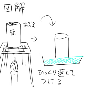 理科の授業で缶の中に少しだけ水を入れて、缶ごとガスバーナーで温めて、中の水が少なくなってきたころ、他の水をはったバットか何かに逆さまにして付けるとどうなるか?みたいな実験をしました。んー…てか説明意味不明だったなあ。