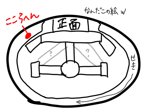 まずですねぇ、私たちの席はここらへんでした。そして会場のつくりが、もうどうしても思い出せないですかなりすみません\(^o^)/ ?のとこは、たぶんこういう斜めの道があったと思うんですがねぇ(´・ω・`) 正面のステージの左右に付属しているのはムービングステージです。